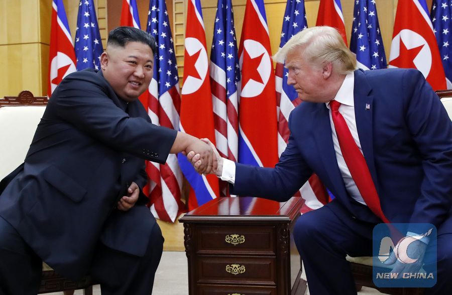 U.S. President Donald Trump (R) and Kim Jong Un, top leader of the Democratic People's Republic of Korea (DPRK), meet at the Freedom House, a South Korean building in the inter-Korean border village of Panmunjom, June 30, 2019. (Xinhua/NEWSIS)