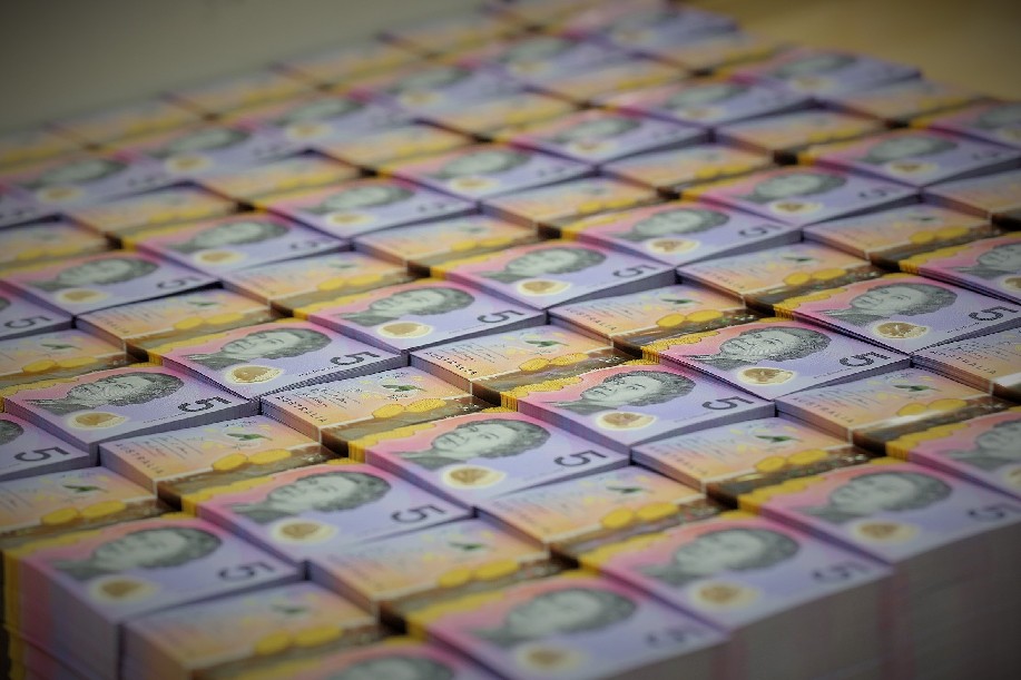 Photo provided by the Reserve Bank of Australia on April 12, 2016 shows stacks of the five Australian dollar banknotes. (Xinhua/Reserve Bank of Australia)