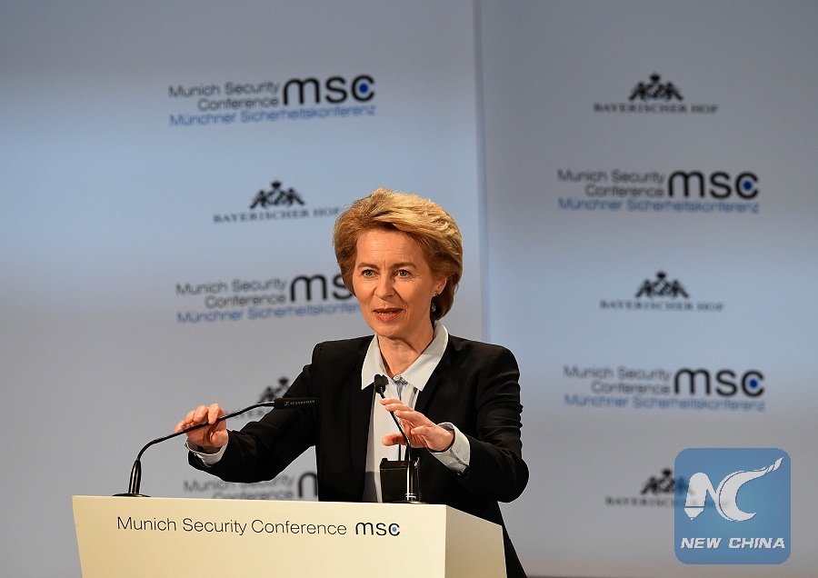 File photo taking on Feb. 15, 2019 shows German Defense Minister Ursula von der Leyen addressing the 55th Munich Security Conference (MSC) in Munich, Germany. (Xinhua/Lu Yang)