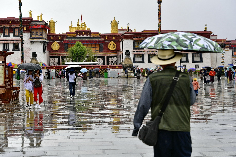 People walk in rain near the Jokhang Temple in Lhasa, southwest China's Tibet Autonomous Region, July 3, 2019. (Xinhua/Zhang Rufeng)