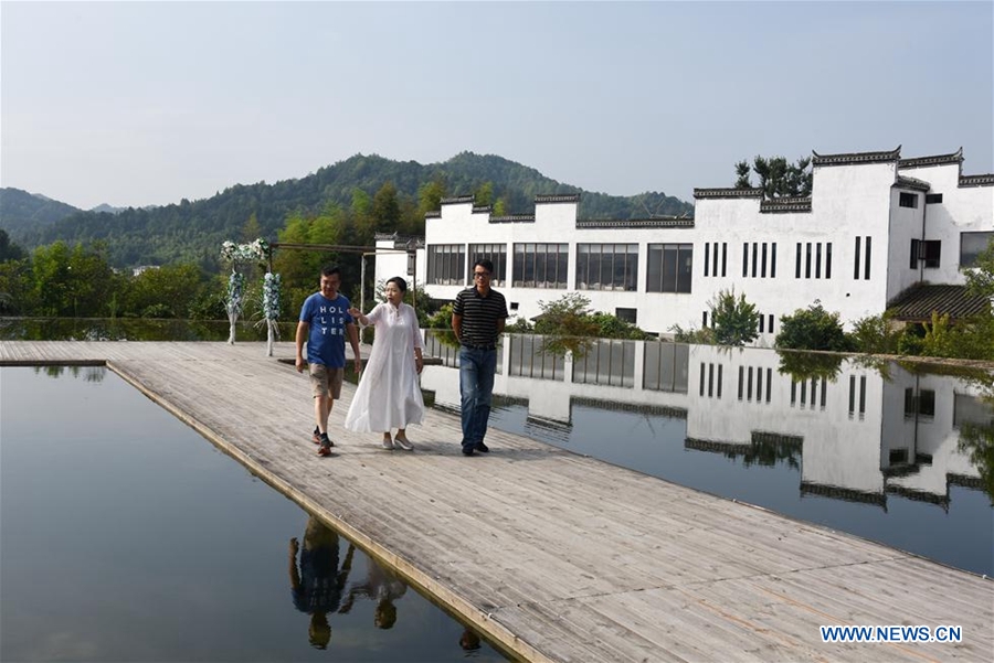 Liu Fang (C), a hotel owner, shows tourists around in Wuyuan County, east China's Jiangxi Province, June 28, 2019. The B&B hotel industry has taken a leap in Wuyuan in recent years. Various measures have been taken to promote local all-for-one tourism, including renovating and decorating hotels and holding cultural activities, so as to improve tourists' experience. As of the end of 2018, Wuyuan County has more than 100 boutique B&B hotels and over 600 public B&B hotels. Wuyuan's B&B hotel business, with a turnover of 1.3 billion yuan in 2018, is gaining momentum in the development of local tourism and rural revitalization. (Xinhua/Zhang Ruiqi)