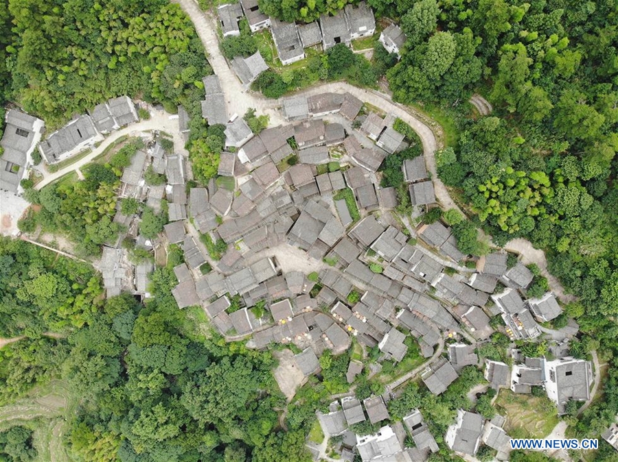Aerial photo taken on June 29, 2019 shows hotels at Huangling scenic spot in Wuyuan County, east China's Jiangxi Province. The B&B hotel industry has taken a leap in Wuyuan in recent years. Various measures have been taken to promote local all-for-one tourism, including renovating and decorating hotels and holding cultural activities, so as to improve tourists' experience. As of the end of 2018, Wuyuan County has more than 100 boutique B&B hotels and over 600 public B&B hotels. Wuyuan's B&B hotel business, with a turnover of 1.3 billion yuan in 2018, is gaining momentum in the development of local tourism and rural revitalization. (Xinhua/Sun Ruibo)