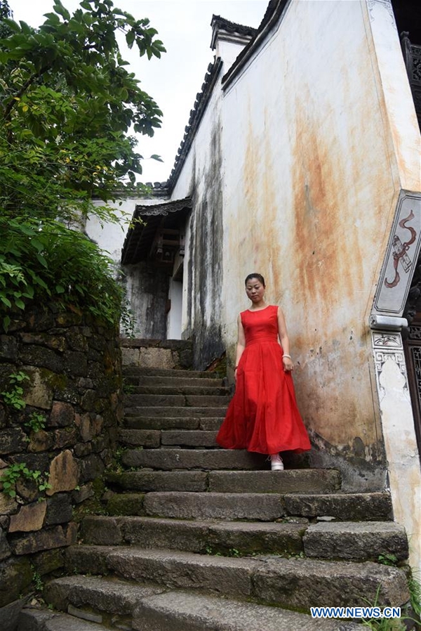 A tourist passes by a hotel at Huangling scenic spot in Wuyuan County, east China's Jiangxi Province, June 29, 2019. The B&B hotel industry has taken a leap in Wuyuan in recent years. Various measures have been taken to promote local all-for-one tourism, including renovating and decorating hotels and holding cultural activities, so as to improve tourists' experience. As of the end of 2018, Wuyuan County has more than 100 boutique B&B hotels and over 600 public B&B hotels. Wuyuan's B&B hotel business, with a turnover of 1.3 billion yuan (189 million US dollars) in 2018, is gaining momentum in the development of local tourism and rural revitalization. (Xinhua/Sun Ruibo)