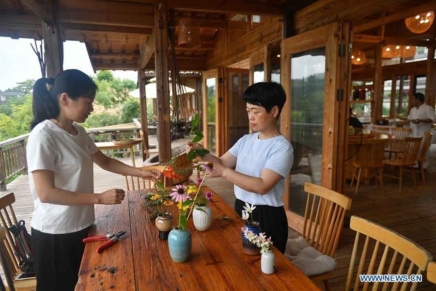 Tourists practice flower arranging, or ikebana, in Qiukou Township of Wuyuan County, east China's Jiangxi Province. The B&B hotel industry has taken a leap in Wuyuan in recent years. Various measures have been taken to promote local all-for-one tourism, including renovating and decorating hotels and holding cultural activities, so as to improve tourists' experience. As of the end of 2018, Wuyuan County has more than 100 boutique B&B hotels and over 600 public B&B hotels. Wuyuan's B&B hotel business, with a turnover of 1.3 billion yuan (189 million US dollars) in 2018, is gaining momentum in the development of local tourism and rural revitalization. (Xinhua/Sun Ruibo)