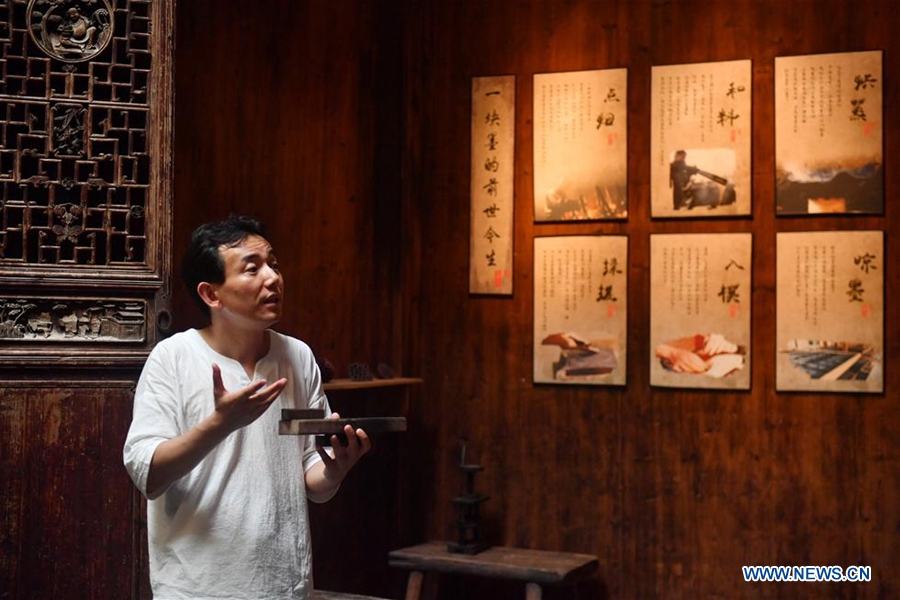 Wu Zhixuan introduces the making of Hui ink, listed as intangible cultural heritage, at his hotel in Wuyuan County, east China's Jiangxi Province, June 28, 2019. The B&B hotel industry has taken a leap in Wuyuan in recent years. Various measures have been taken to promote local all-for-one tourism, including renovating and decorating hotels and holding cultural activities, so as to improve tourists' experience. As of the end of 2018, Wuyuan County has more than 100 boutique B&B hotels and over 600 public B&B hotels. Wuyuan's B&B hotel business, with a turnover of 1.3 billion yuan (189 million US dollars) in 2018, is gaining momentum in the development of local tourism and rural revitalization. (Xinhua/Sun Ruibo)