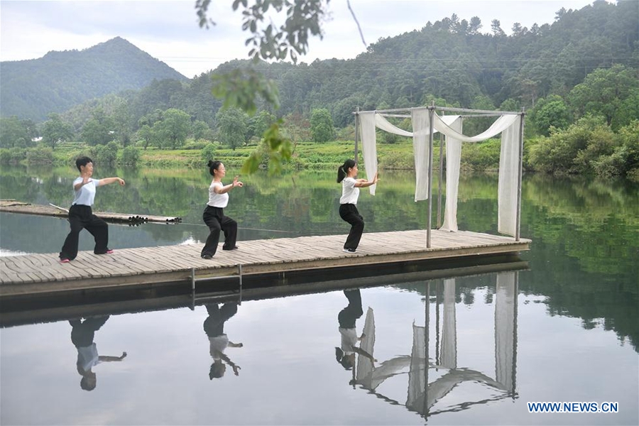 Tourists try Taijiquan, or shadow boxing, near a hotel in Qiukou Township in Wuyuan County, east China's Jiangxi Province, July 2, 2019. The B&B hotel industry has taken a leap in Wuyuan in recent years. Various measures have been taken to promote local all-for-one tourism, including renovating and decorating hotels and holding cultural activities, so as to improve tourists' experience. As of the end of 2018, Wuyuan County has more than 100 boutique B&B hotels and over 600 public B&B hotels. Wuyuan's B&B hotel business, with a turnover of 1.3 billion yuan (189 million US dollars) in 2018, is gaining momentum in the development of local tourism and rural revitalization. (Xinhua/Sun Ruibo)