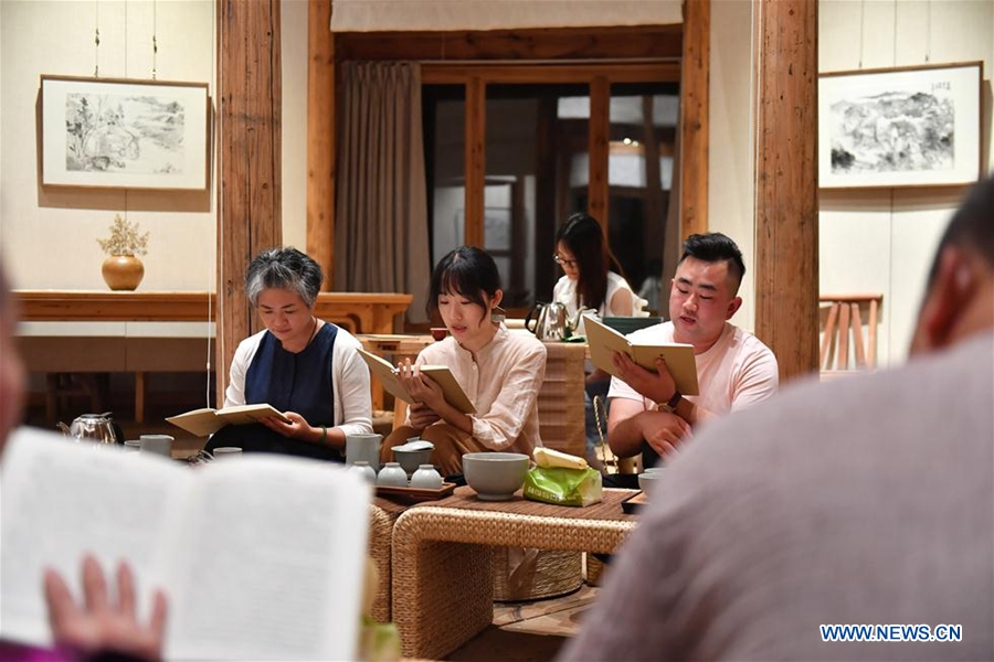 Tourists take part in a reading event at a hotel in Qiukou Township in Wuyuan County, east China's Jiangxi Province, June 29, 2019. The B&B hotel industry has taken a leap in Wuyuan in recent years. Various measures have been taken to promote local all-for-one tourism, including renovating and decorating hotels and holding cultural activities, so as to improve tourists' experience. As of the end of 2018, Wuyuan County has more than 100 boutique B&B hotels and over 600 public B&B hotels. Wuyuan's B&B hotel business, with a turnover of 1.3 billion yuan in 2018, is gaining momentum in the development of local tourism and rural revitalization. (Xinhua/Sun Ruibo)