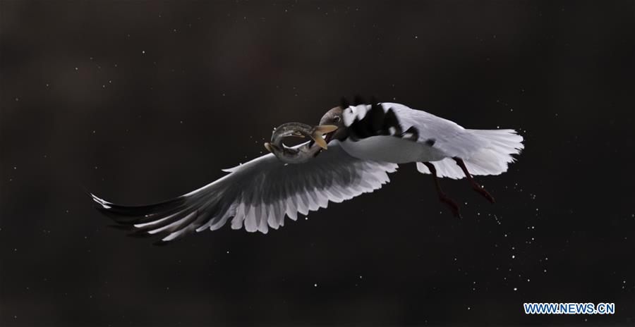 A brown-headed gull catches a naked carp in Shaliu River, Gangca County of northwest China's Qinghai Province, July 6, 2019. The species of carp, known in China as huangyu, is endemic to the Qinghai Lake, China's largest inland saltwater lake located on the plateau. From late May to mid-August every year, the carp swim upstream to freshwater rivers to spawn, with the migration peaking in late June. The fish was listed on the China Species Red List in 2004 due to overfishing and habitat loss. Thanks to the increased efforts of volunteers and intensified law enforcement, the stock of the carp in the lake has largely climbed in recent years. (Xinhua/Fei Maohua)
