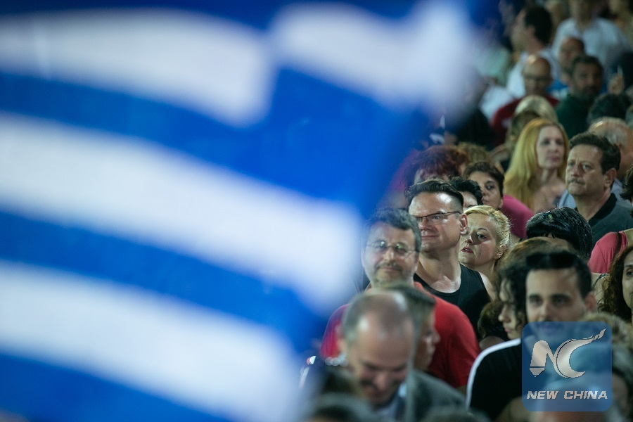 People watch the main pre-electoral rally of the Greek Prime Minister Alexis Tsipras on Syntagma Square in Athens, Greece on July 5, 2019. (Xinhua/Lefteris Partsalis)