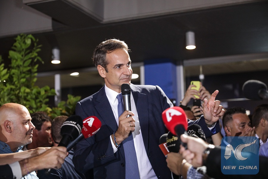 ATHENS, July 8 (Xinhua) -- Kyriakos Mitsotakis, leader of Greece's conservative New Democracy party, was sworn in on Monday as Greece's new prime minister after winning Sunday's national snap elections.