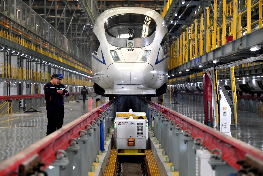 Engineers with China Railway Zhengzhou Group Co., Ltd operate a robot to scan and check a bullet train in Zhengzhou, central China's Henan Province, on Feb. 20, 2019. (Xinhua)