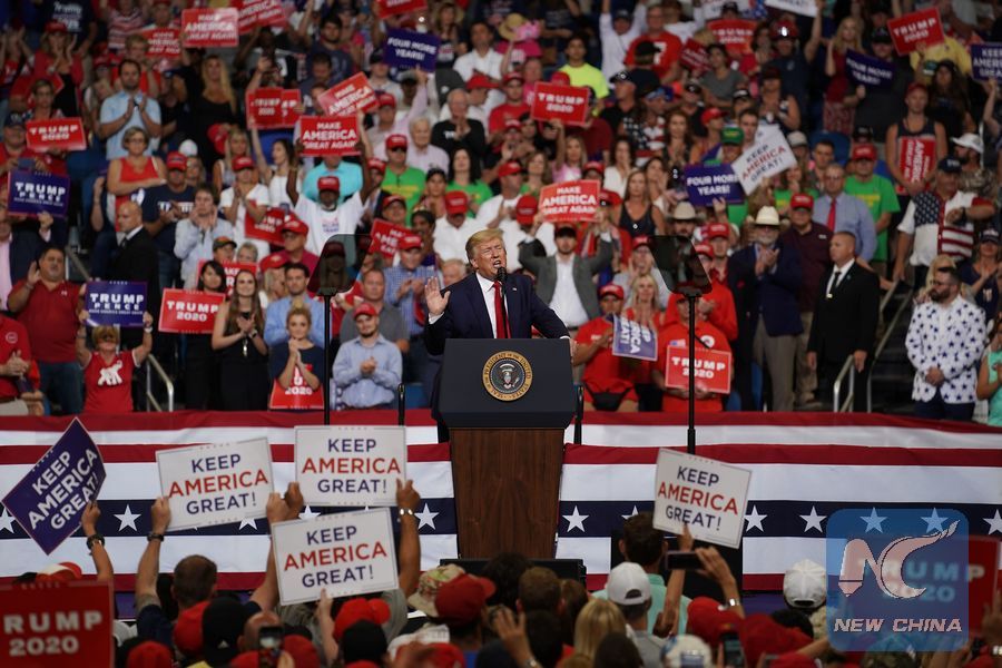 File Photo: U.S. President Donald Trump participates in a rally in Orlando, Florida, the United States, June 18, 2019. Trump formally kicked off his 2020 re-election campaign at a rally in Orlando. (Xinhua/Liu Jie)