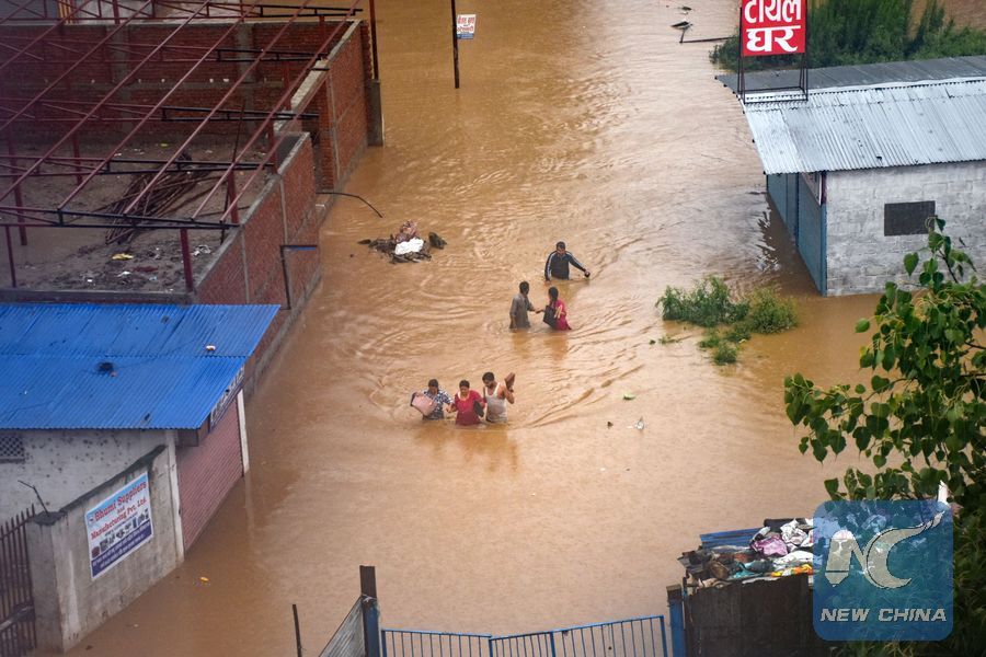 People tread in the flood in Kathmandu, Nepal, July 12, 2019. (Xinhua/sunil sharma)