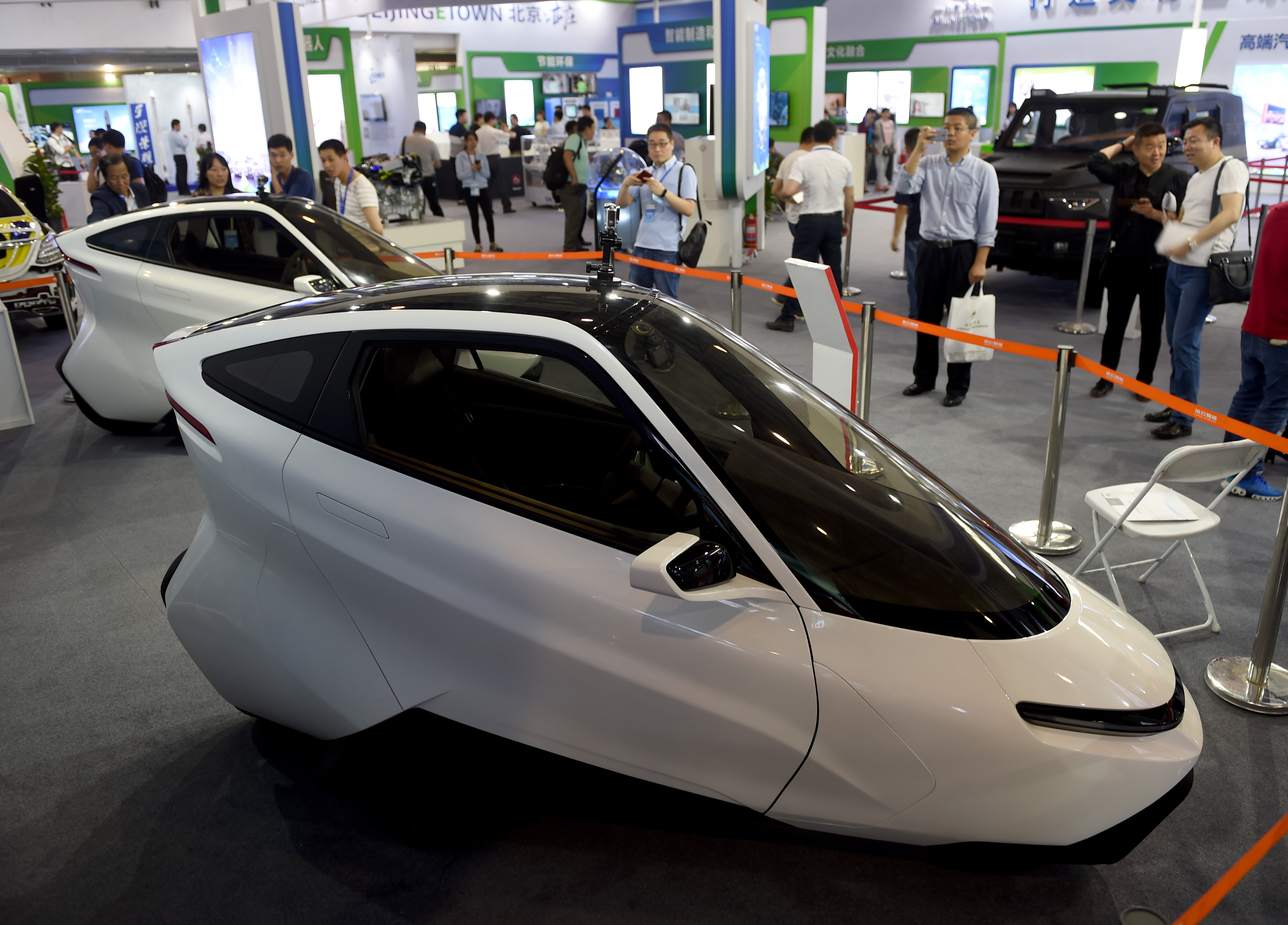 Visitors view electric vehicles at the 21st China Beijing International High-tech Expo in Beijing, capital of China, May 17, 2018. (Xinhua)