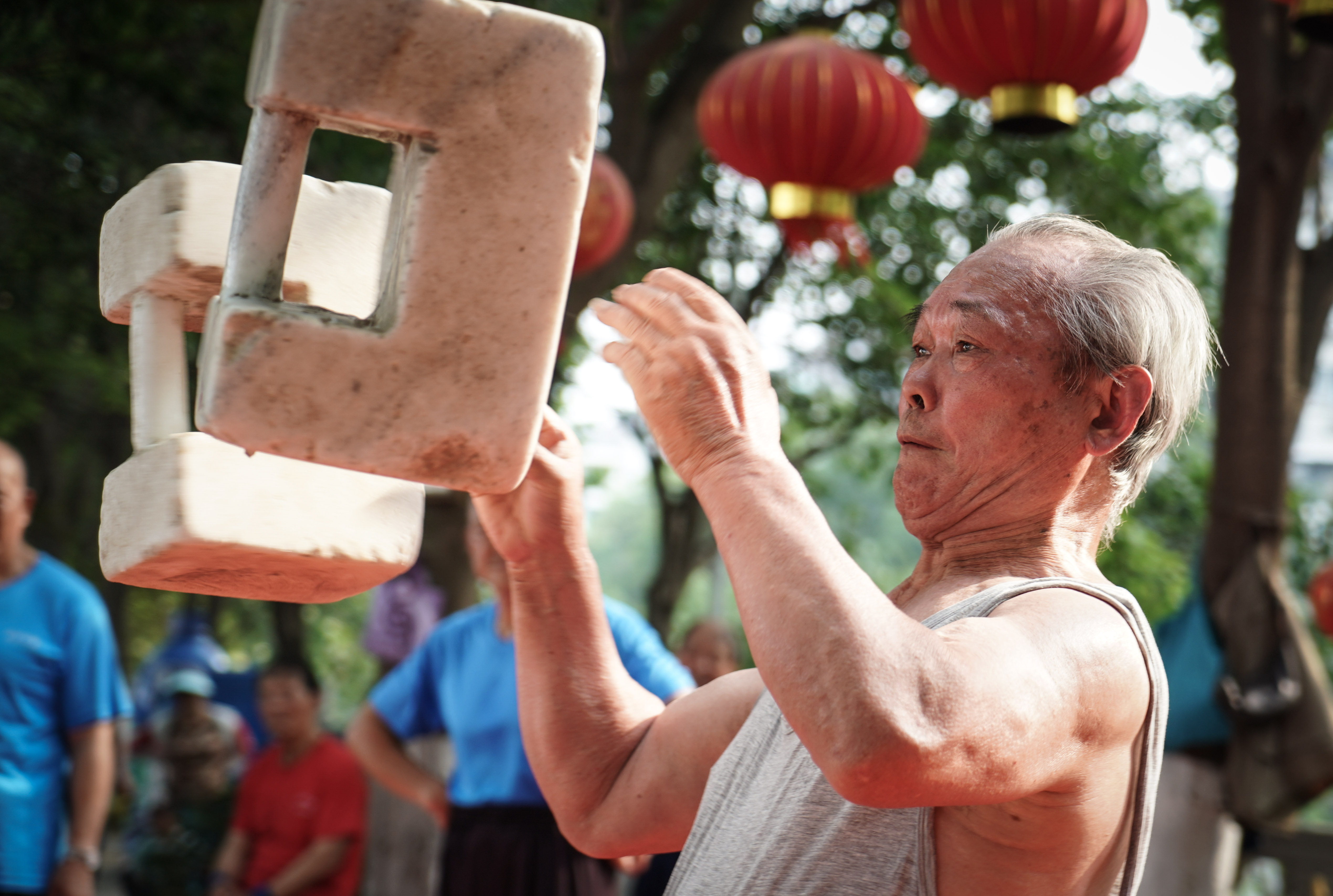 BEIJING, July 16 (Xinhua) -- Shisuo (stone lock), a stone dumbbell in the form of ancient padlock, is usually seen in the traditional Chinese workout routine.