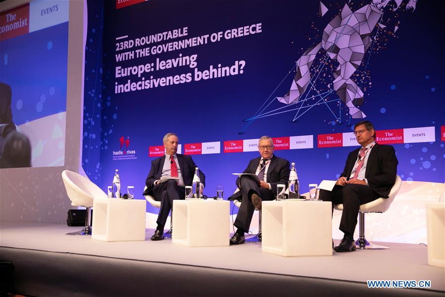 Klaus Regling (C), Managing Director of the European Stability Mechanism (ESM), and Pavlos Mylonas (R), CEO of the National Bank of Greece, attend an economic forum in Athens, Greece, on July 16, 2019. Greece's new Finance Minister Christos Staikouras pledged reforms to boost economic growth and outlined the new conservative government's economic policy priorities during the economic forum on Tuesday. Visiting European Stability Mechanism (ESM) Managing Director Klaus Regling welcomed Staikouras' remarks, stressing on his part the need for Greece to respect commitments undertaken under bailout agreements in the post-bailout era. (Xinhua/Lefteris Partsalis)