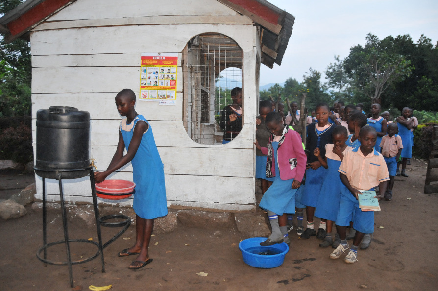 Pupils queue to wash their hands with chlorinated water to prevent the spread of Ebola at the St. John Kamasasa Primary School in Kasese district, Western Uganda, June 18, 2019. Uganda's Ministry of Health has so far registered three confirmed cases of Ebola after the deadly disease spread over the border from Democratic Republic of Congo. (Xinhua/Nicholas Kajoba)