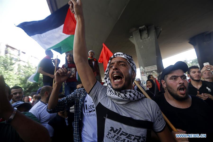 Palestinian refugees take part in a protest in Beirut, Lebanon, on July 16, 2019. A large number of Palestinians in Beirut held protests against an initiative from Lebanese Labor Minister in early June that aims to regulate foreign workers in Lebanon. (Xinhua/Bilal Jawich)