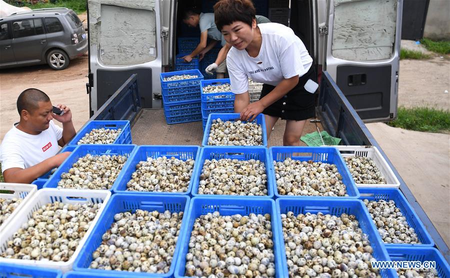 Villagers load quail eggs on a truck in Qiaotou Town of Mingguang City, east China's Anhui Province, July 18, 2019. Qiaotou Town has promoted quail farming to boost villagers' income by integrating cooperatives with local farmers. So far the annual amount of quails raised in Qiaotou has exceeded 1 million as quail eggs and meat are widely sold in places including Shanghai and Jiangsu Province. (Xinhua/Liu Junxi)