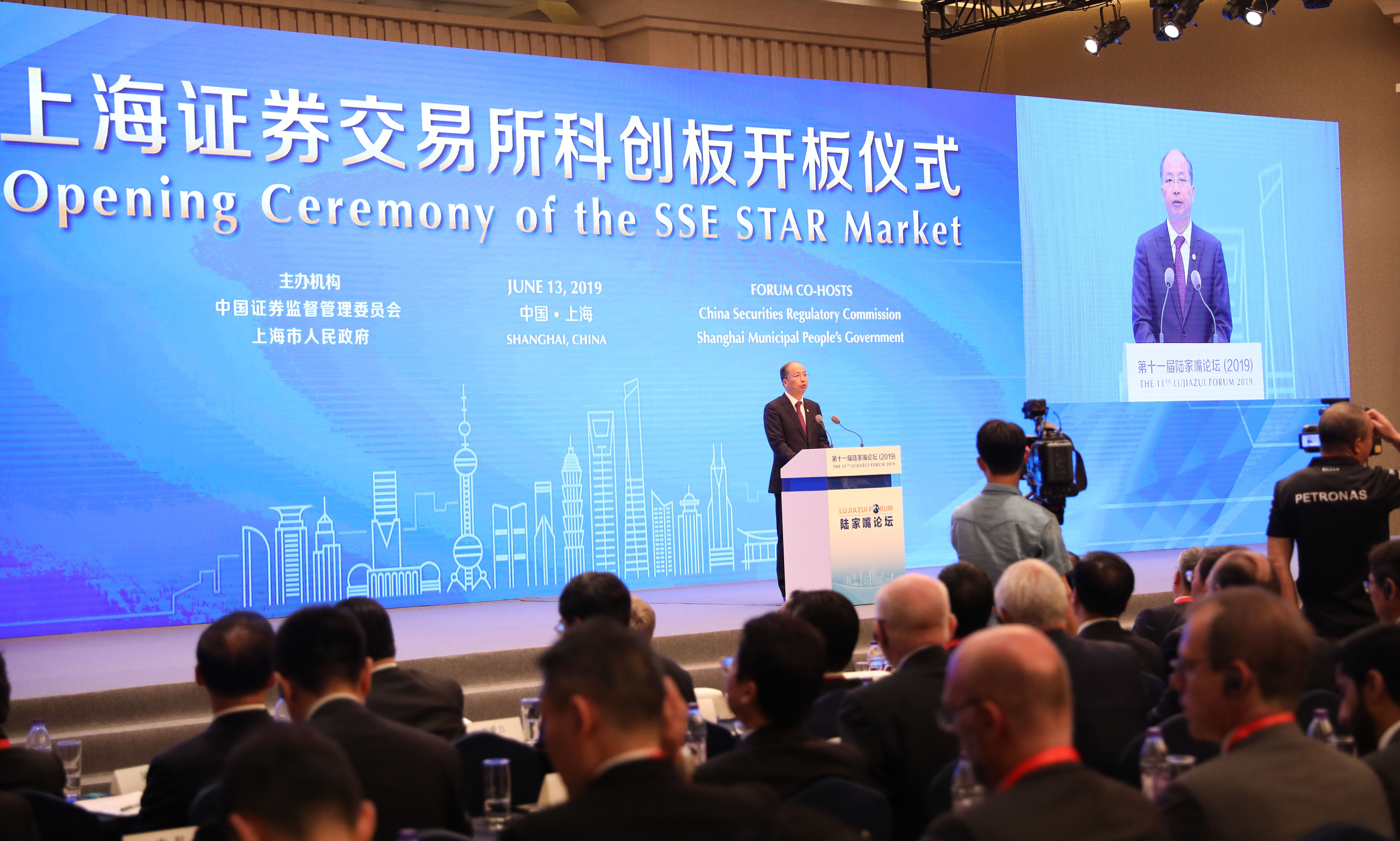 Yi Huiman, chairman of the China Securities Regulatory Commission, addresses the launching ceremony of the sci-tech innovation board of the Shanghai Stock Exchange at the Lujiazui Forum in Shanghai, east China, June 13, 2019. (Xinhua/Fang Zhe)