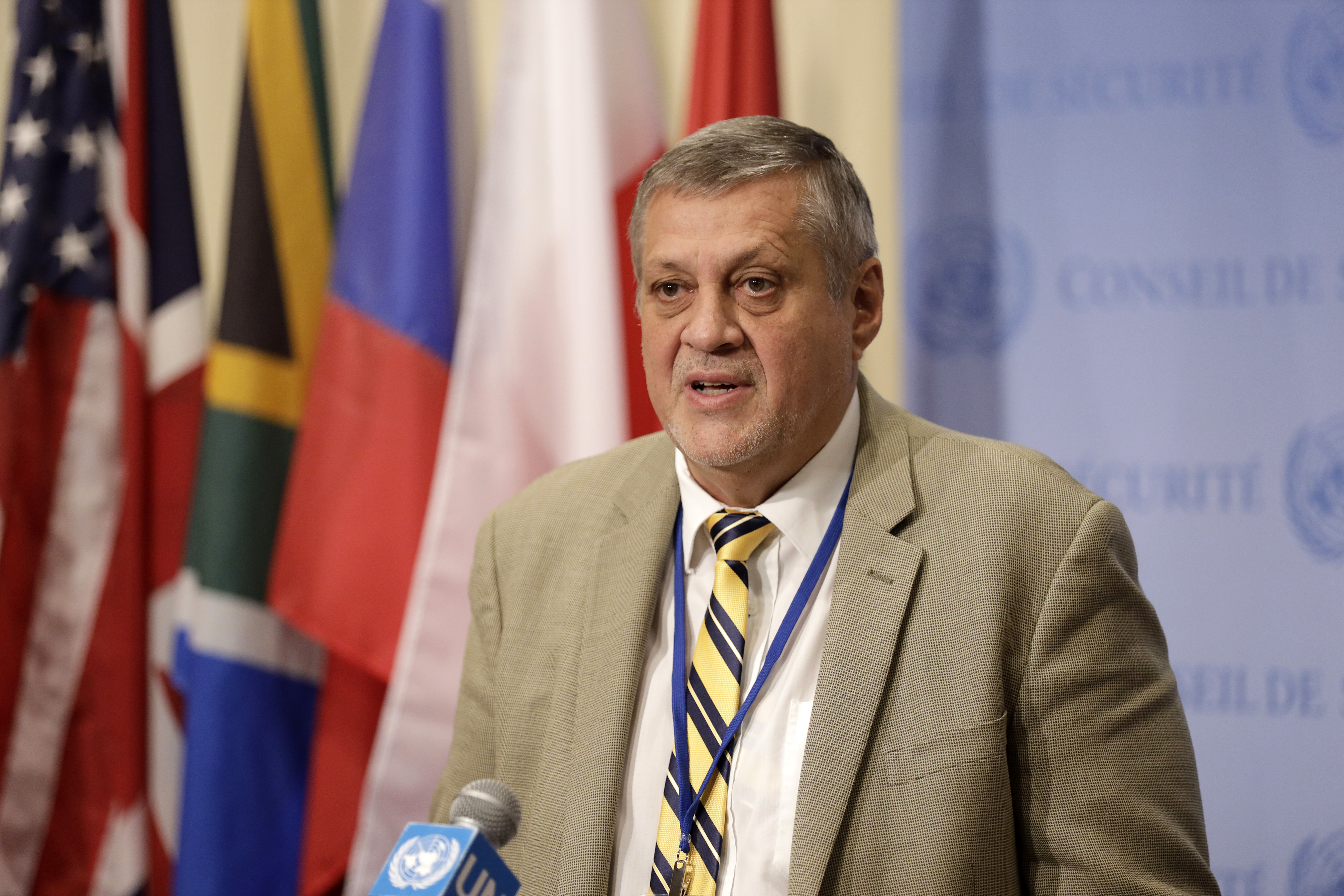 Jan Kubis, United Nations Special Coordinator for Lebanon, speaks to journalists following the Security Council consultations at the UN headquarters in New York, July 22, 2019. (Xinhua/Li Muzi)