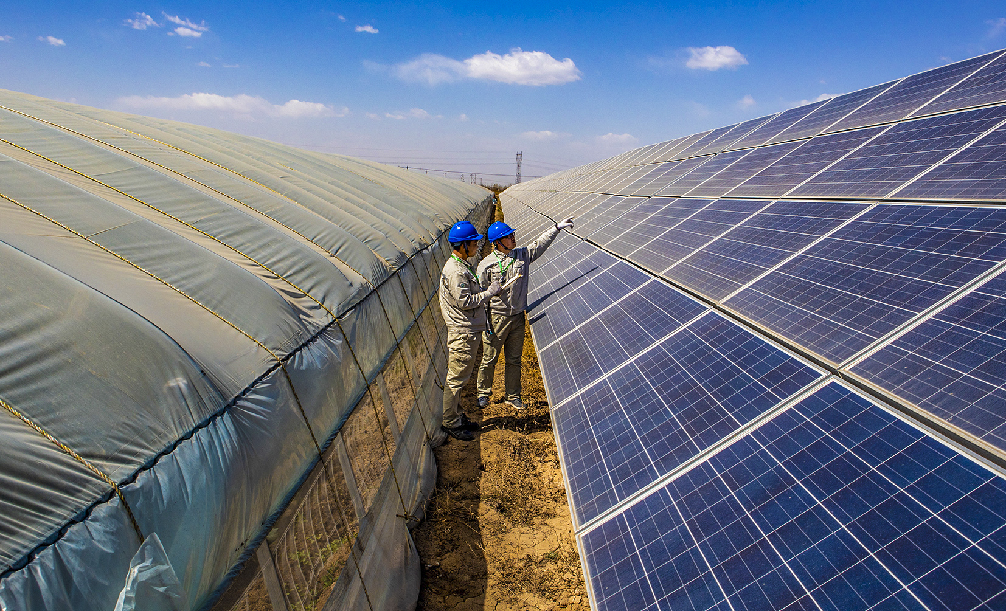 Technicians check the the condition of photovoltaic (PV) solar panels at a PV station beside a greenhouse in Wuyi County, north China's Hebei Province, on March 30, 2019. (Xinhua/Li Xiaoguo)