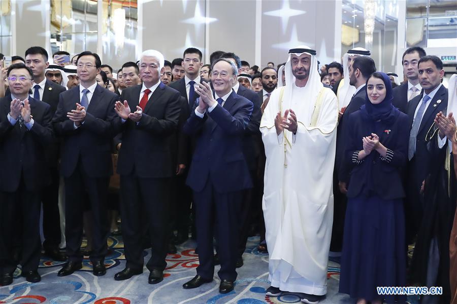 Chinese Vice President Wang Qishan attends a reception marking the 35th anniversary of the establishment of diplomatic relations between China and the United Arab Emirates (UAE) and meets with visiting Sheikh Mohammed bin Zayed Al Nahyan, crown prince of Abu Dhabi of the UAE, in Beijing, capital of China, July 23, 2019. (Xinhua/Liu Bin)