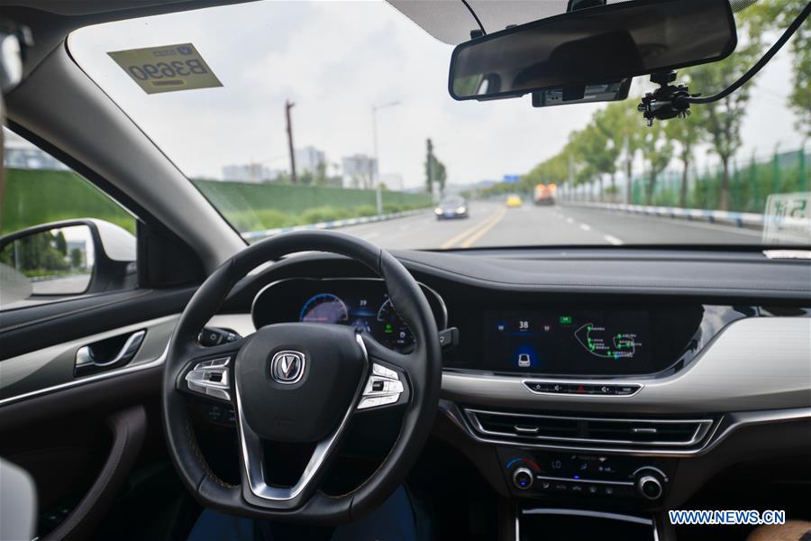 A Level 4 (L4) self-driving Changan Automobile takes a driving test in a pilot zone for 5G-based autonomous driving in southwest China's Chongqing Municipality, July 24, 2019. The pilot zone equipped with Level 4 (L4) self-driving capabilities was launched in Chongqing on Thursday. (Xinhua/Liu Chan)