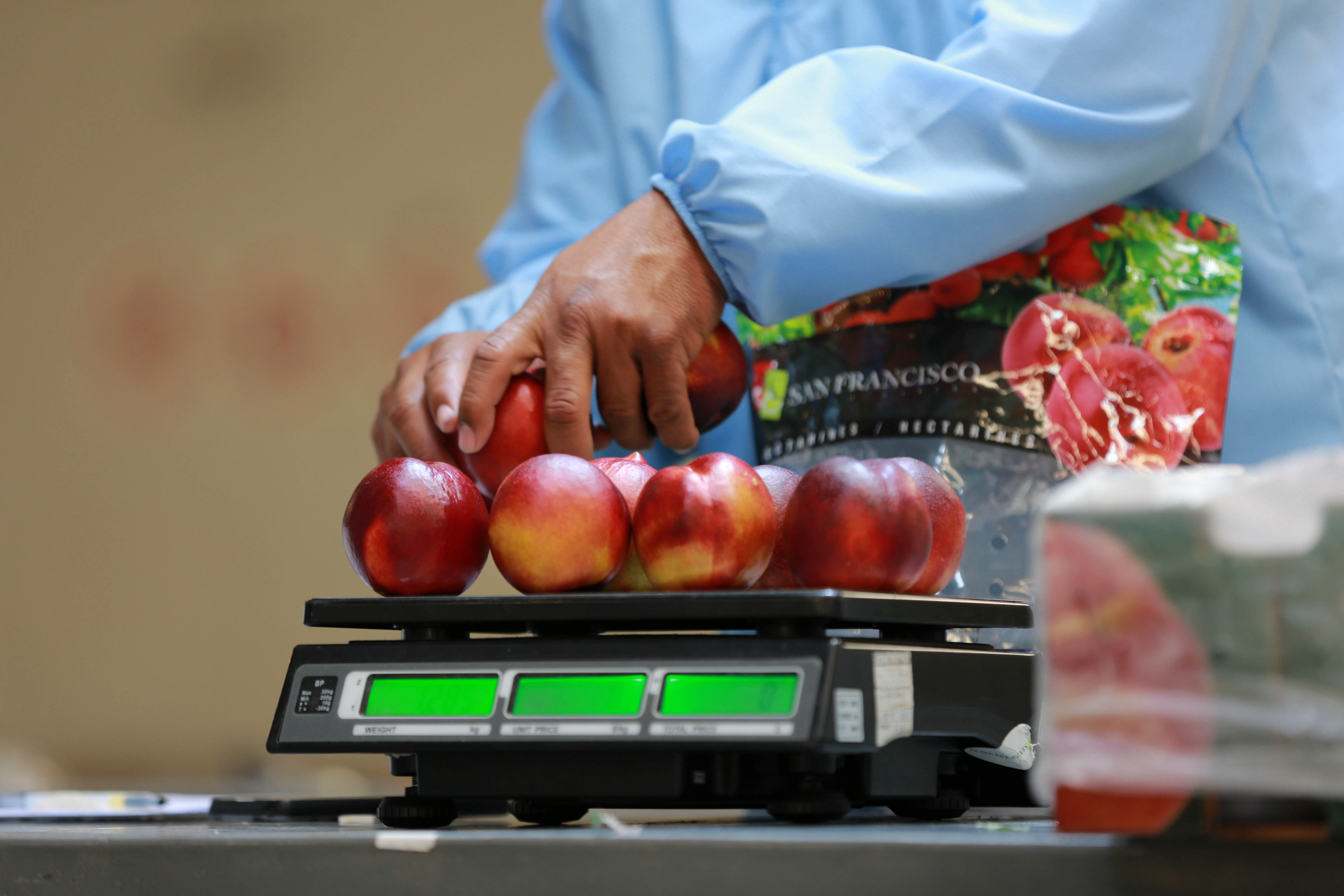 A worker weighs nectarines in a factory of Agricola Garces in Mostazal, Chile on Jan. 19, 2018. Chilean cherries have been viewed by Chinese customers as a "trademark" from the Latin American country. (Xinhua/Xu Rui)