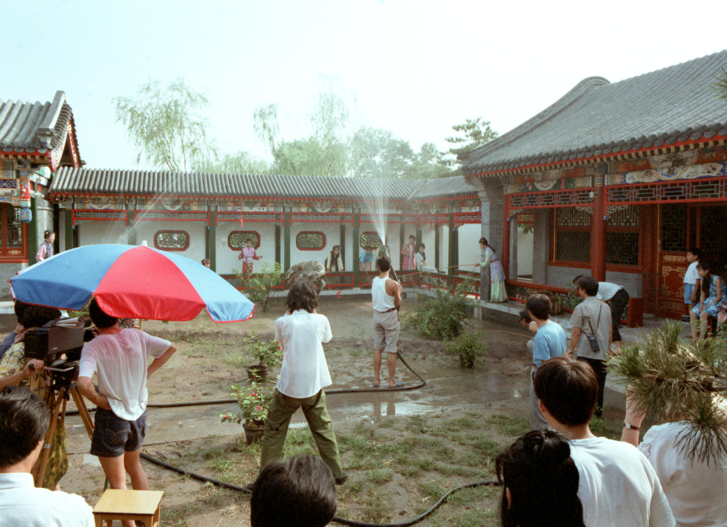 A rainy scene of the classic Chinese TV series "A Dream of Red Mansions" is being filmed. (Xinhua/Song Lianfeng)
