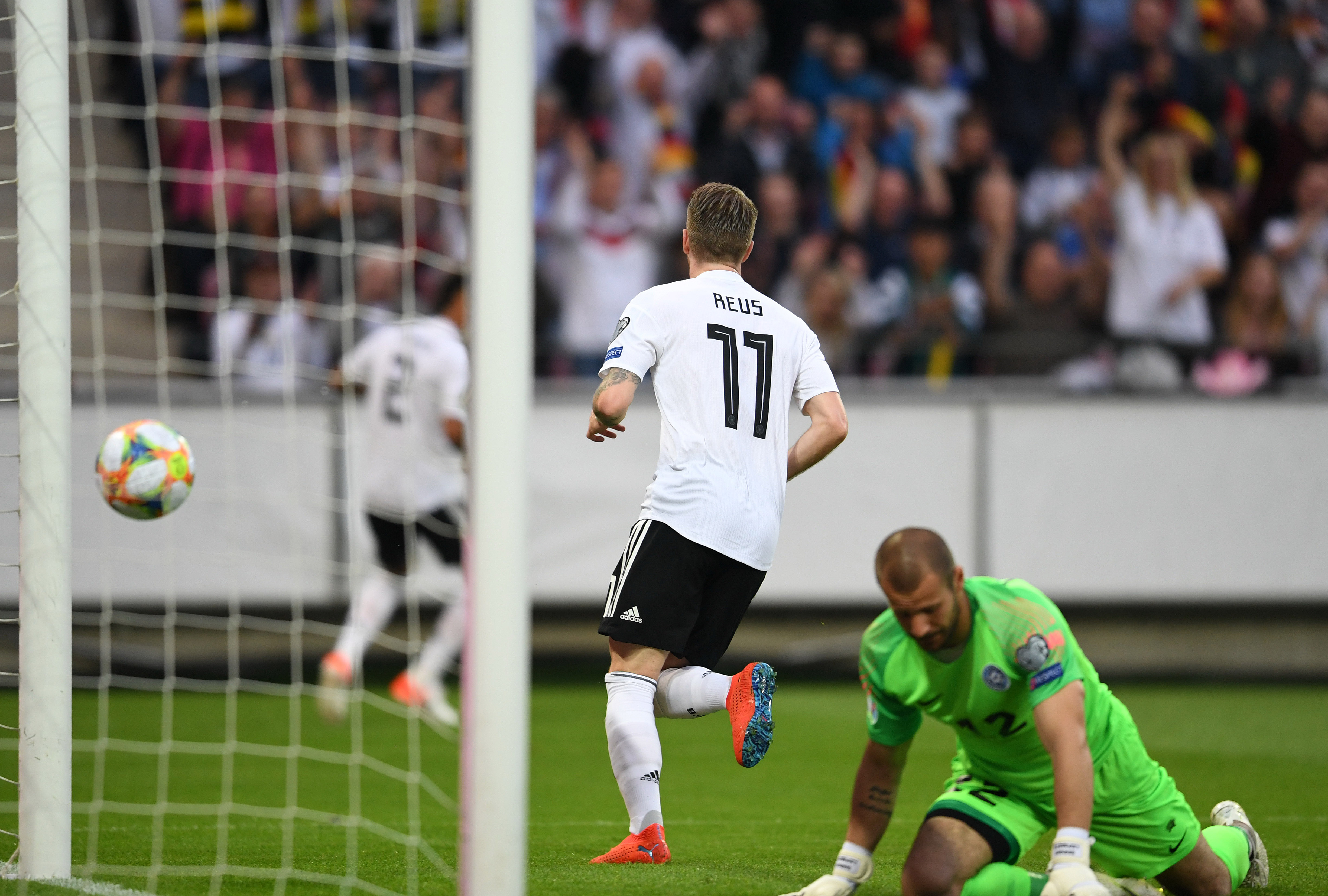 Marco Reus (L) of Germany scores during the UEFA Euro 2020 group C qualifying football match between Germany and Estonia in Mainz, Germany, on June 11, 2019. Germany won 8-0. (Xinhua/Lu Yang)
