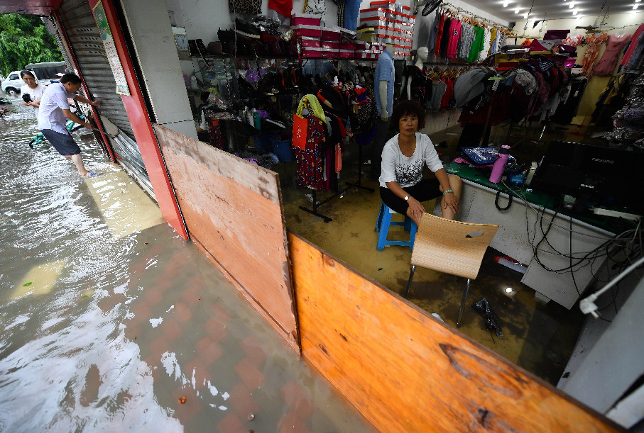 Shops are submerged along the Longhua Road in Haikou, south China's Hainan Province, Aug. 1, 2019. (Xinhua/Guo Cheng)