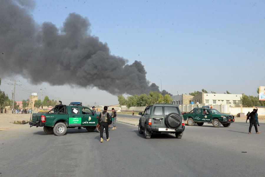 The file photo shows members of Afghan security forces stand guard at the site of the attack outside the provincial police headquarters in Kandahar, capital of Afghanistan's southern Kandahar province, July 18, 2019. At least 12 people were killed and over 90 others injured in the attack. (Xinhua/Sanaullah Seiam)