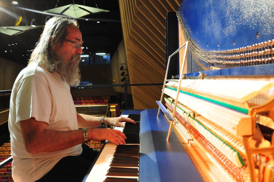 Piano builder David Klavins is playing the world's largest vertical piano. (Xinhua/Janis)