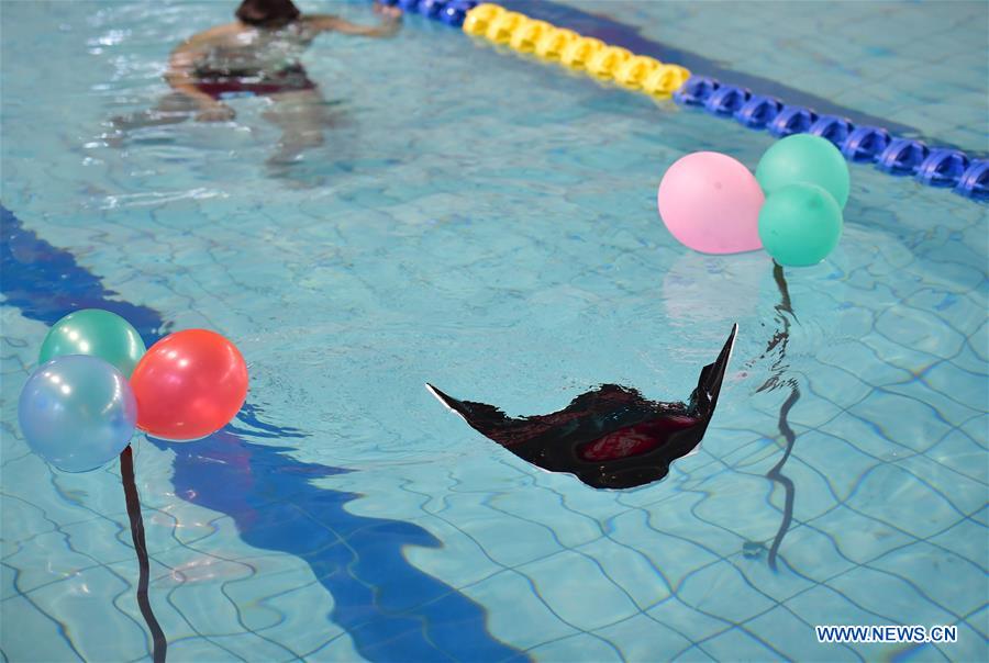 A biomimetic robot swerves in a swimming pool in Xi'an, northwest China's Shaanxi Province, on Aug. 3, 2019. Chinese researchers in Northwestern Polytechnical University have developed a biomimetic robot in the shape of a manta ray, or devilfish, that can flap its wings and slide underwater. The researchers created the bionic soft robot prototype modeled on the shape and motion of a manta ray. The prototype, with a wingspan of 80 cm, is powered by a lithium battery and can swim at a speed of up to 1.85 km per hour. The team will test the robot in lake conditions soon and in the open ocean next year. They also plan to load more sensors for visual and sound detection on the robot for further research. (Xinhua/Shao Rui)