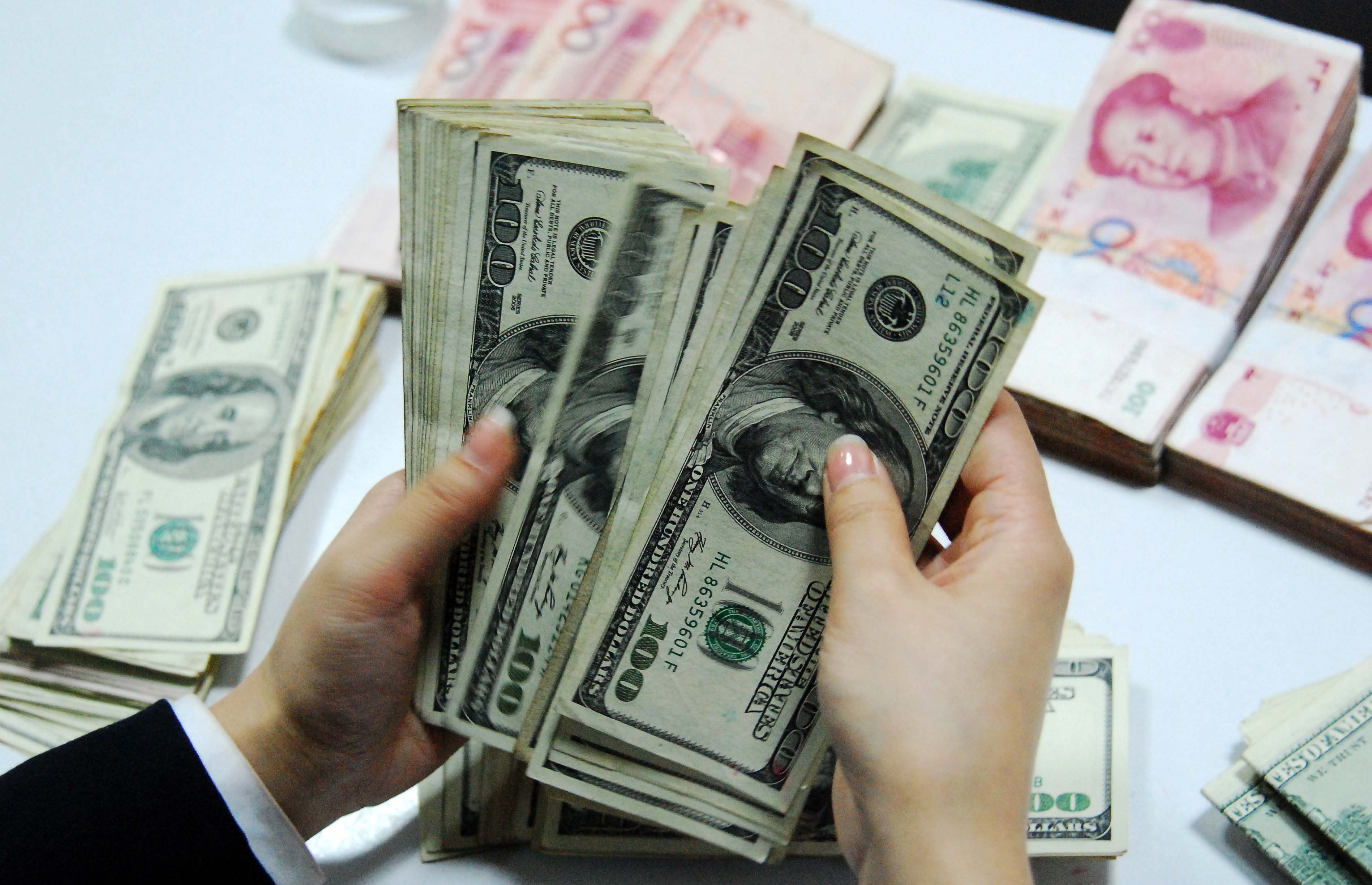 A teller counts US dollars at a bank in Jiujiang, Jiangxi Province, east China. (Xinhua)