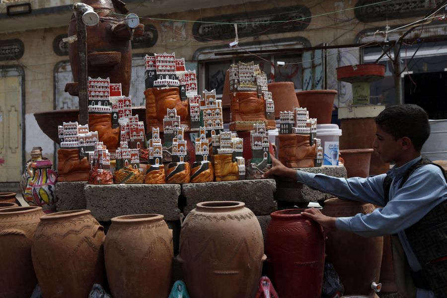 A seller arranges his potteries at a roadside shop in the outskirts of Sanaa, Yemen, on Aug. 3, 2019. (Xinhua/Mohammed Mohammed)
