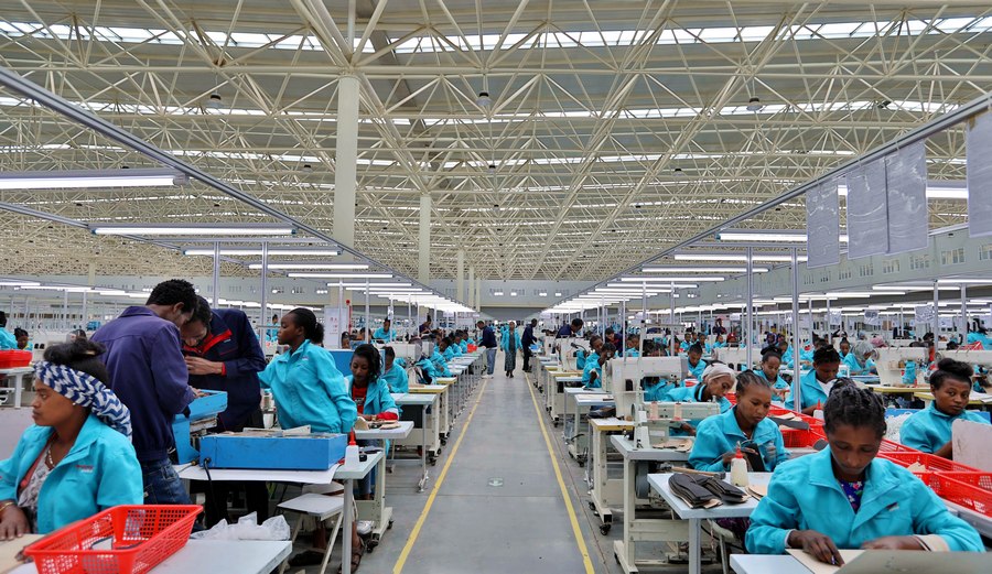 Shoemakers work on the production line at Huajian Light Industry City in Addis Ababa, Ethiopia, June 12, 2019. (Xinhua/Wang Teng)