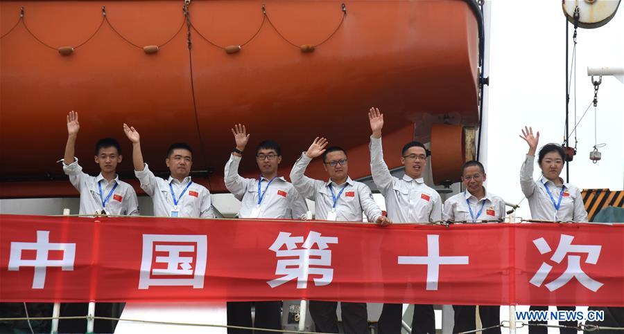 Members of an expedition team wave goodbye to family members on board Xiangyanghong 01, China's elite scientific research ship, in Qingdao, east China's Shandong Province, Aug. 10, 2019. Xiangyanghong 01 departed from Qingdao for the 10th Arctic expedition on Saturday. (Xinhua/Zhang Xudong)