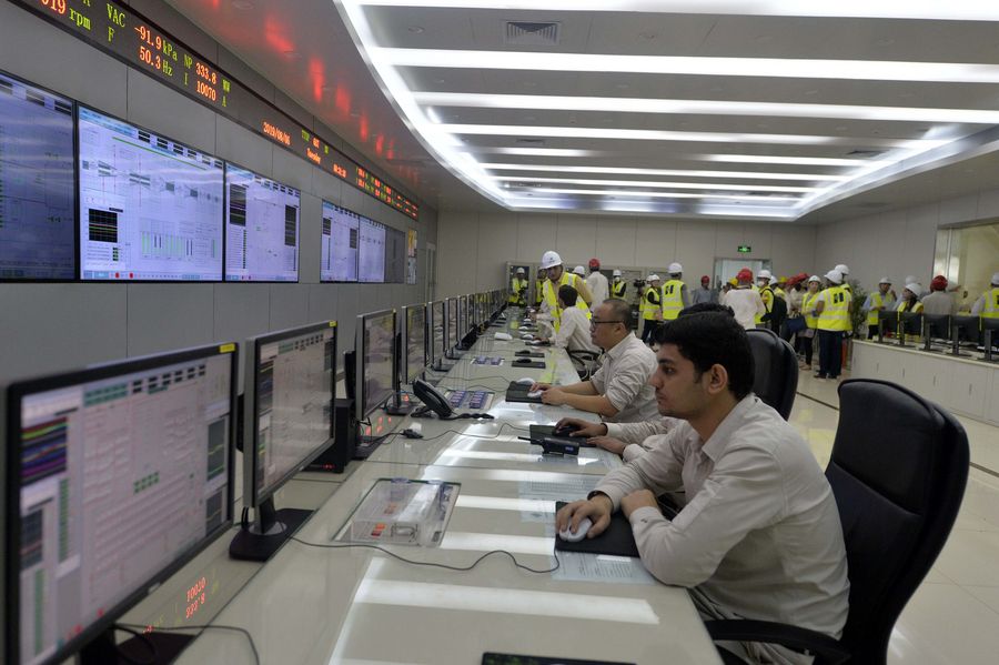 People work in the control room of the Sahiwal Coal Power plant in Sahiwal, Punjab Province, Pakistan, on Aug. 6, 2019. (Xinhua/Ahmad Kamal)