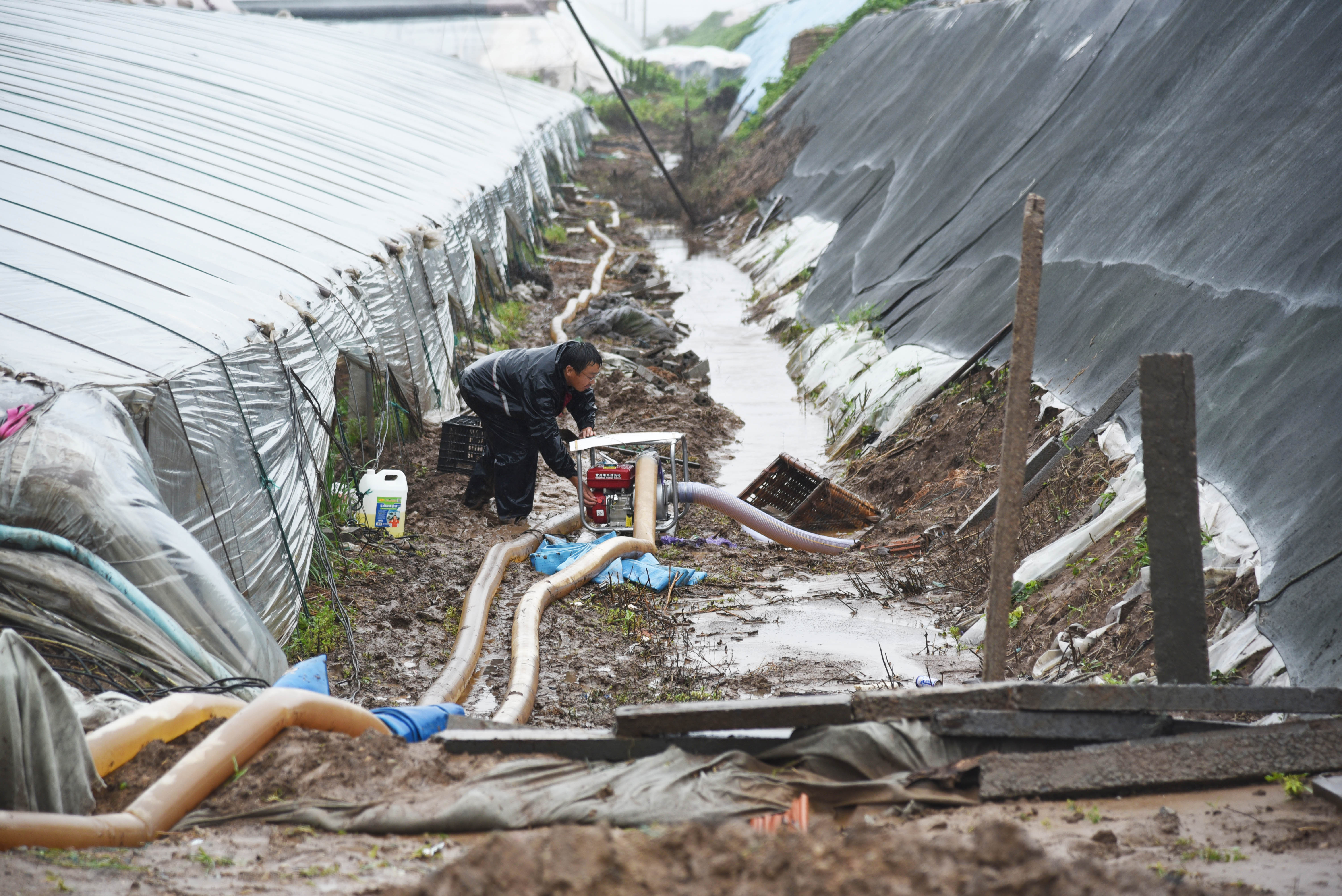 A farmer gets rid of water from a flooded greenhouse in the aftermath of Typhoon Lekima in Dongfangxi Village of Jitai Township, Shouguang, east China's Shandong Province, Aug. 12, 2019. (Xinhua/Wang Kai)