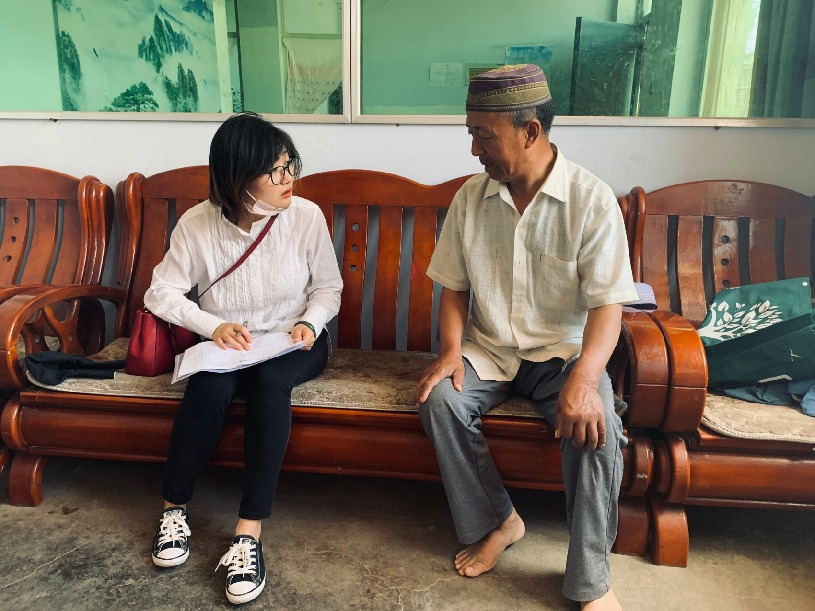 Hu Binbin, 27, explains the latest national policies to a local resident in the city of Qingtongxia, Ningxia Hui Autonomous Region, northwest China. (Xinhua photo)