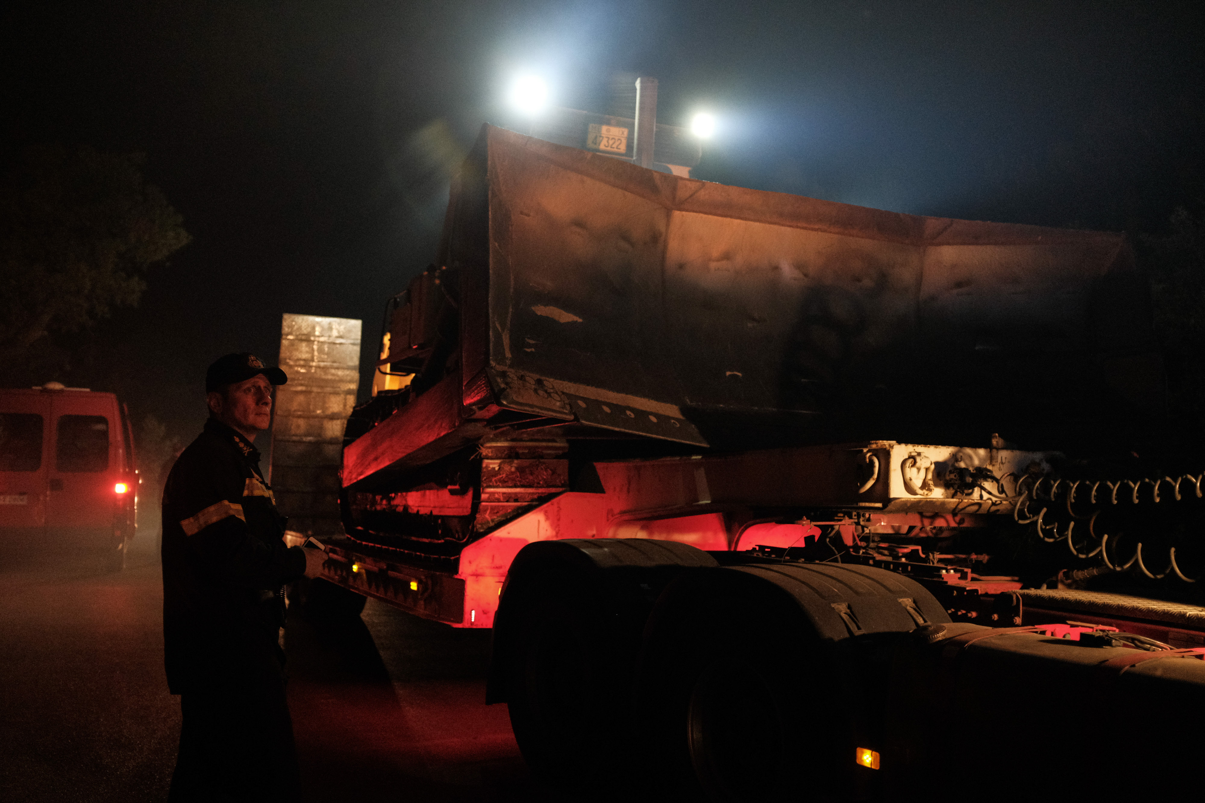 A grader truck is moved to the front of the raging blaze near Makrymalli village on Evia island, Greece, on Aug. 13, 2019.(Photo by Nick Paleologos/Xinhua)