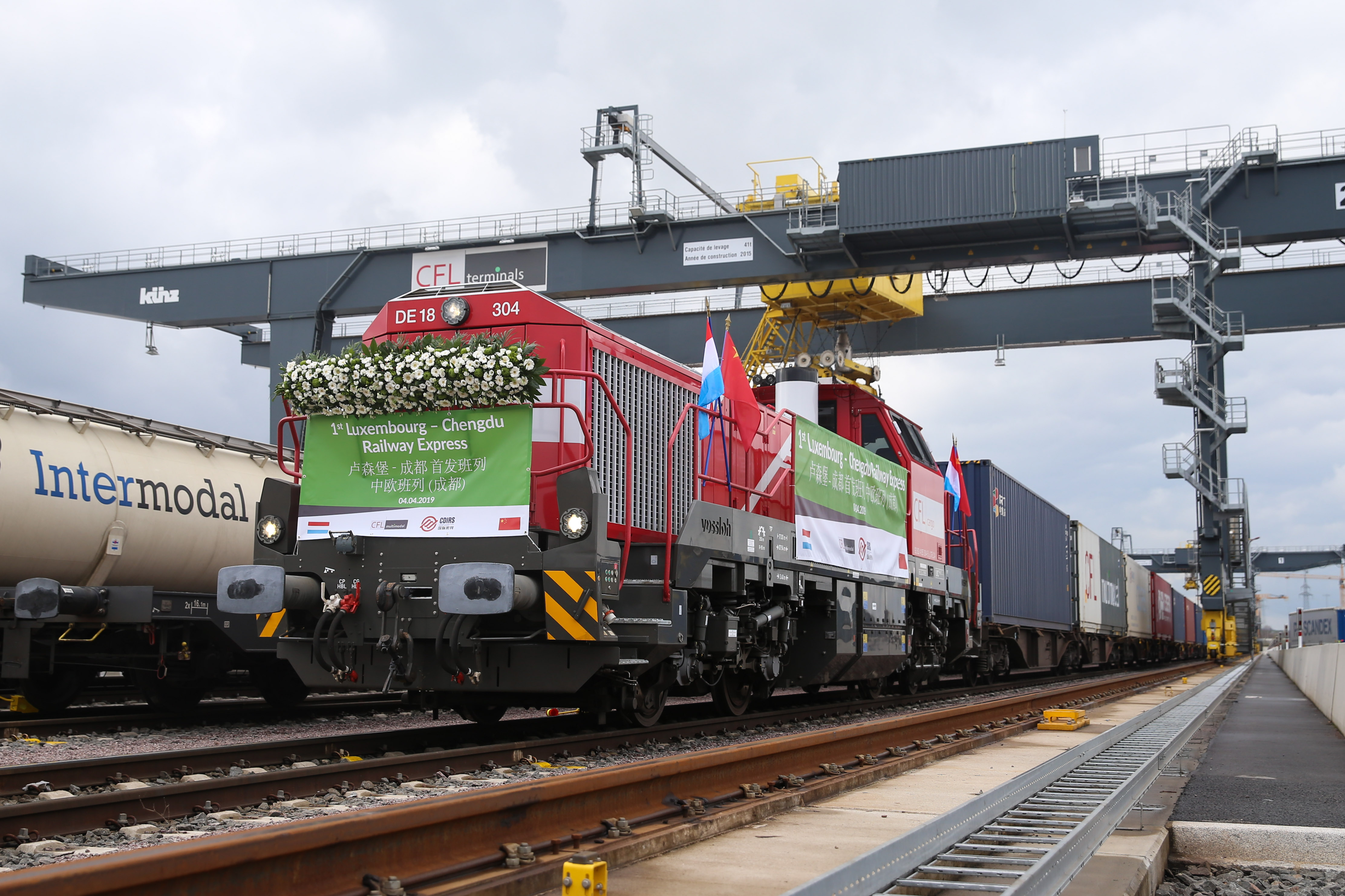 The first Luxembourg-Chengdu freight train departs from a cargo train station in Dudelange, Luxembourg, April 4, 2019. (Xinhua/Zheng Huansong)