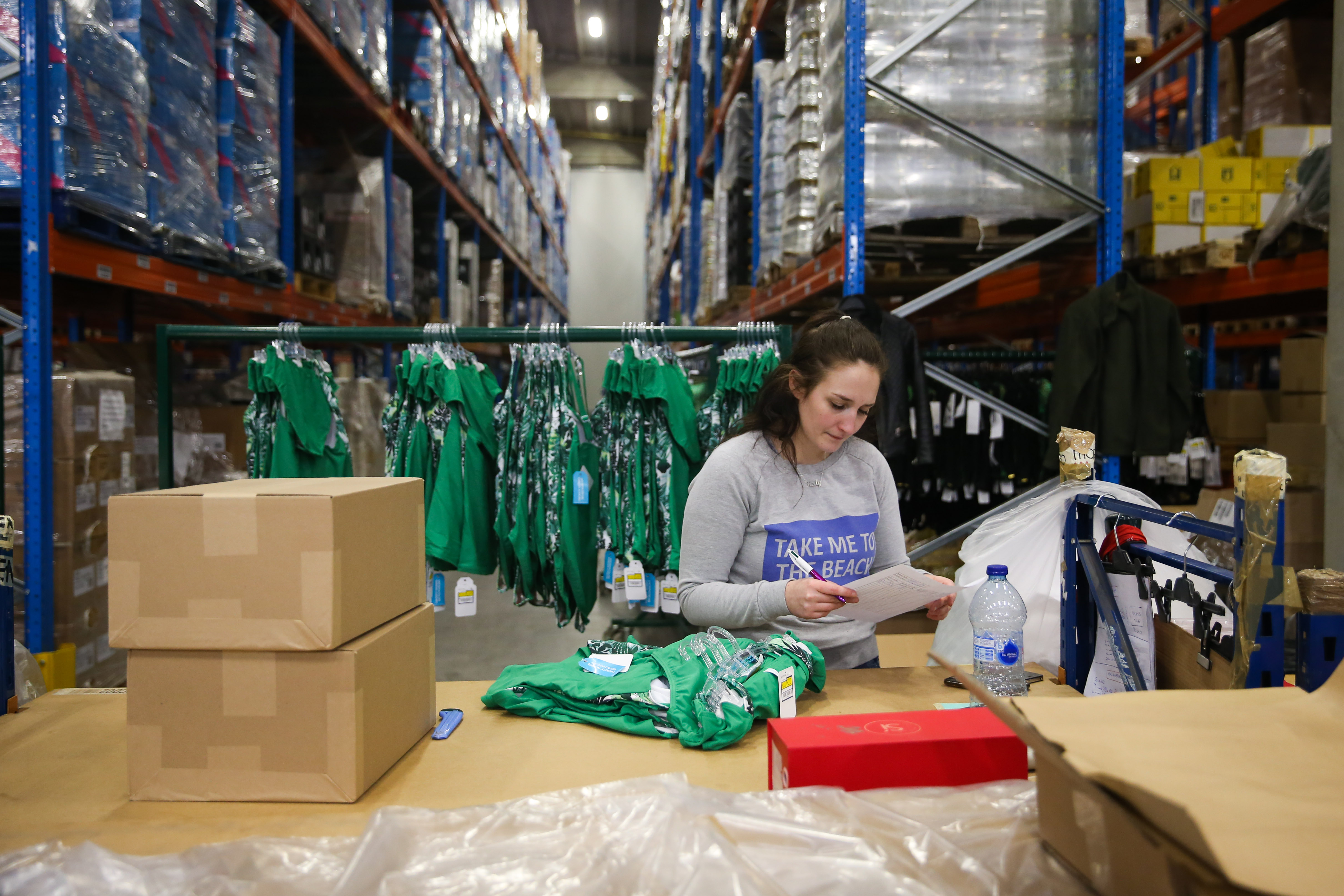 A staff member checks swimming suits imported from China at a warehouse of Ziegler Group in Brussels, Belgium, April 3, 2019. (Xinhua/Zheng Huansong)