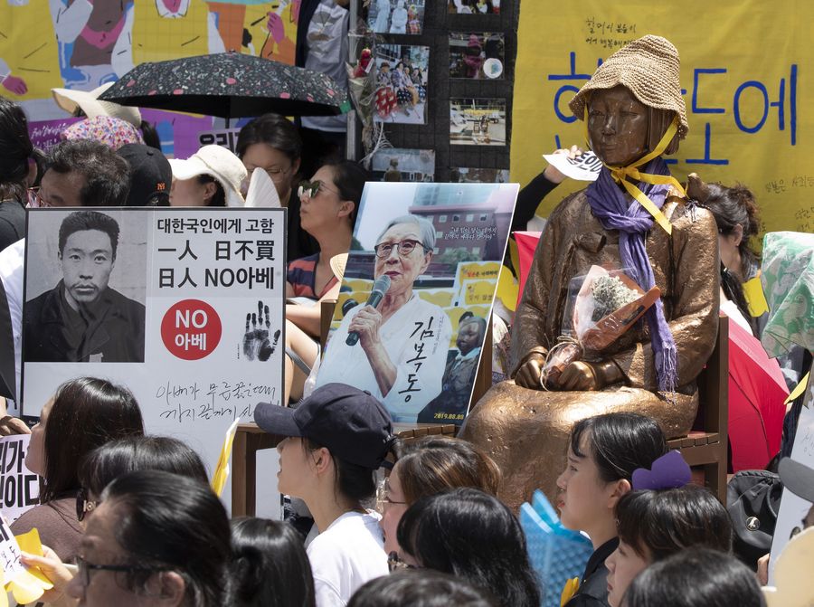 South Korea's government and people commemorate the memorial day for Korean women, who were forced into sex slavery for Japan's military brothels during WWII, in Seoul, South Korea on Aug. 14, 2019. (Xinhua/Lee Sangho)