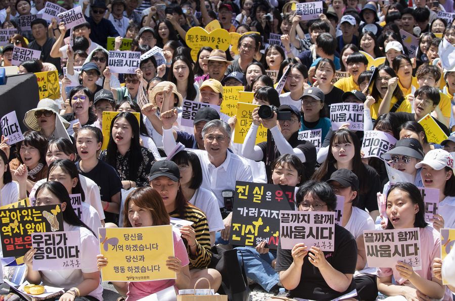 The 1,400th Wednesday rally, first staged in 1992, was held in front of the Japanese Embassy in Seoul earlier in the day, demanding the Japanese government's sincere apology and legal reparation for Japan's wartime crime against humanity.