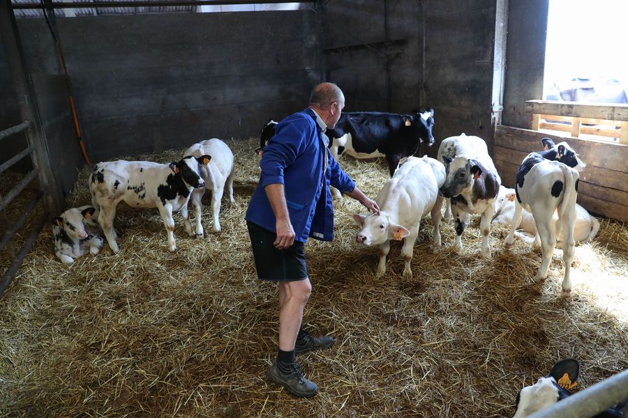 Belgian farmer Philippe Saudoyez takes care of Belgian Blue cattle at his farm in Merbes-Sainte-Marie, Belgium's Hainaut province, Aug. 12, 2019. (Xinhua/Zhang Cheng)