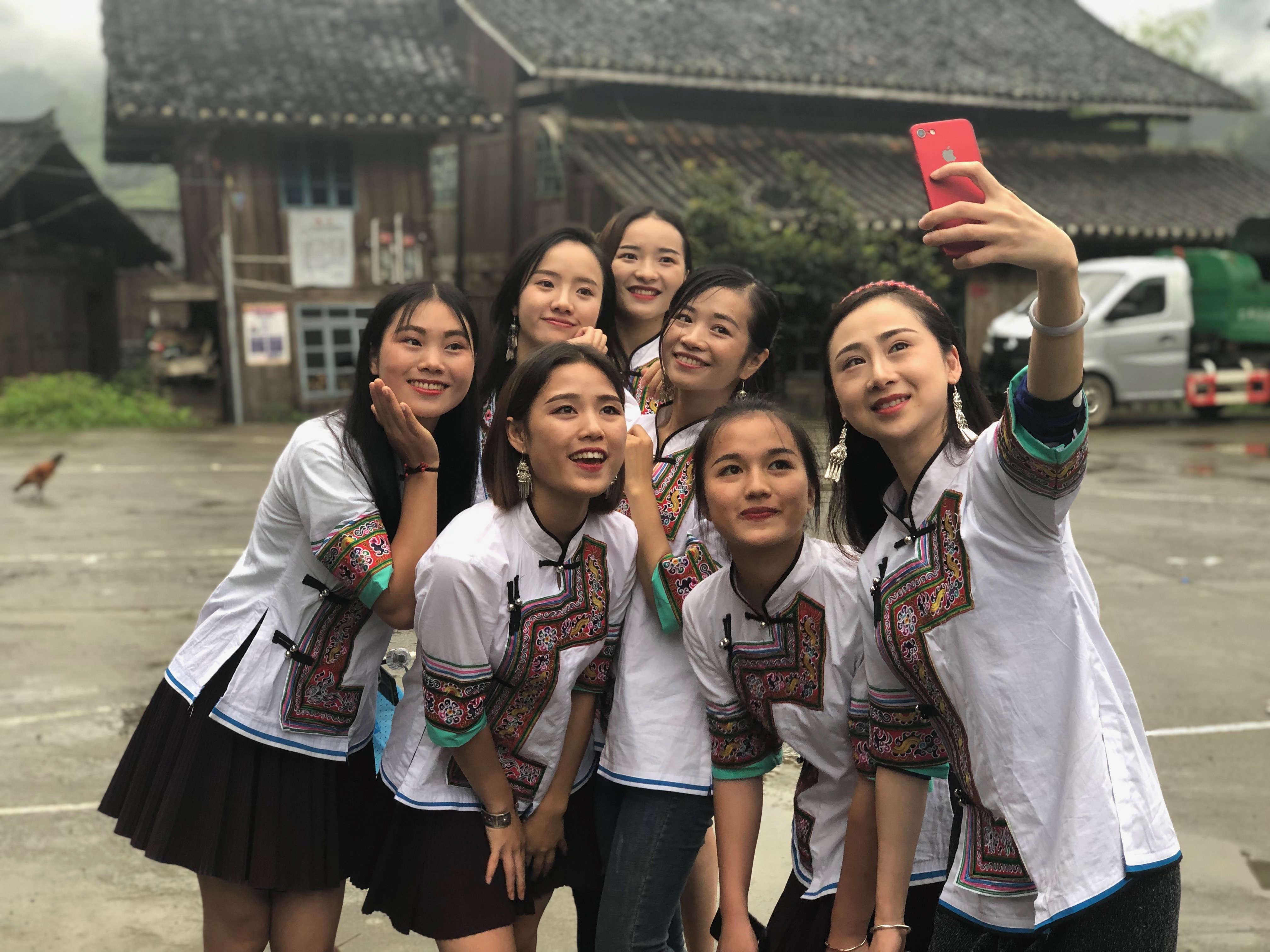 Members of the "Seven Dong Fairies" take a selfie after taking video clips in Gaibao Village of Liping County, southwest China's Guizhou Province, July, 11, 2019. (Xinhua/Liu Zhiqiang)