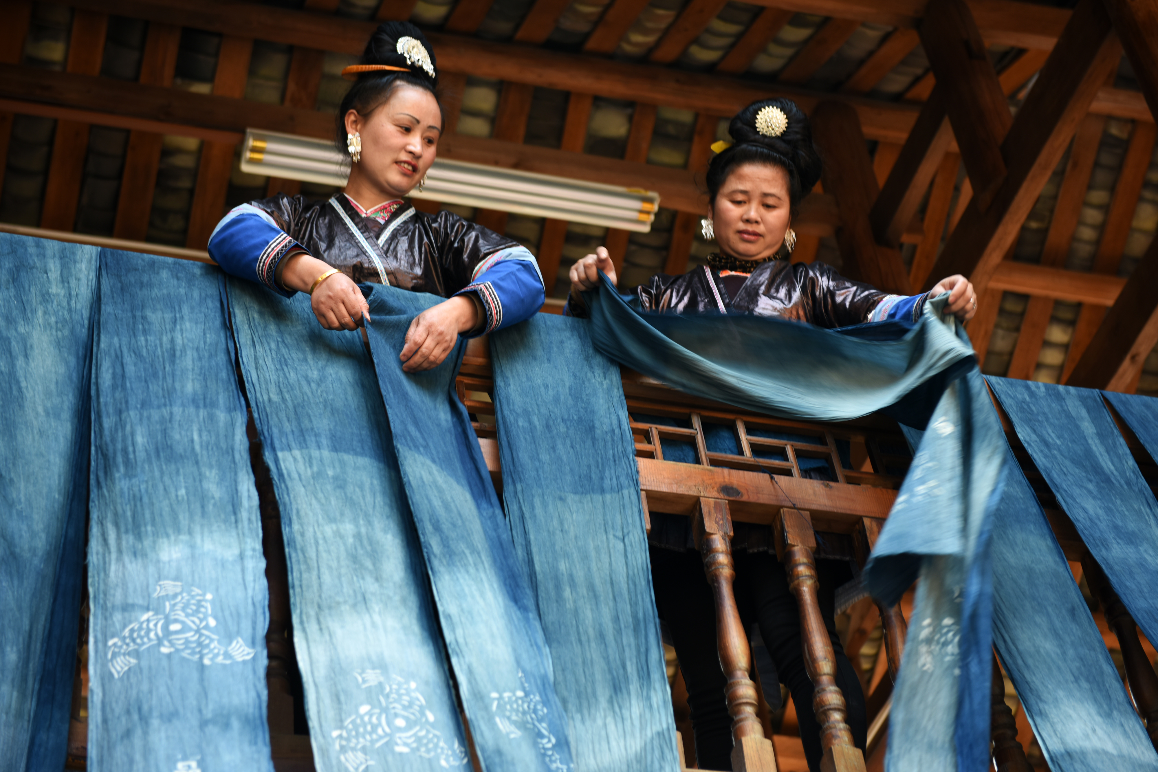 Women of Dong ethnic group dry Dong cloth at a rural traditional craft cooperative in Liping County, southwest China's Guizhou Province, March 12, 2019. (Xinhua/Yang Wenbin)